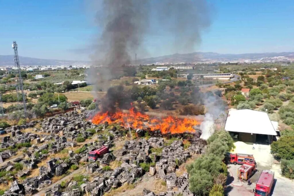 Manisa’nın Yunusemre ilçesi eski Muradiye Mahalle yolunda faaliyet gösteren ahşap palet fabrikasının depo alanında çıkan yangına itfaiye takımlarının müdahalesi devam ediyor. Yangına çok sayıda itfaiye grubu sevk edilirken bölgede sıhhat takımları de yaşanabilecek bir aksiliğe karşı hazır bekletiliyor. Yangını söndürmek için takımların çalışması devam ederken yangın havadan görüntülendi. Manzaralarda depo alanının neredeyse yarısının alevlere teslim olduğu görülüyor. – MANİSA