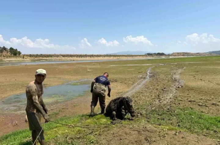 Manisa'nın Alaşehir ilçesinde su arayışında bulunan iki katır, bataklığa saplandı. Mehmet Sistem'in kurtarma eforu...